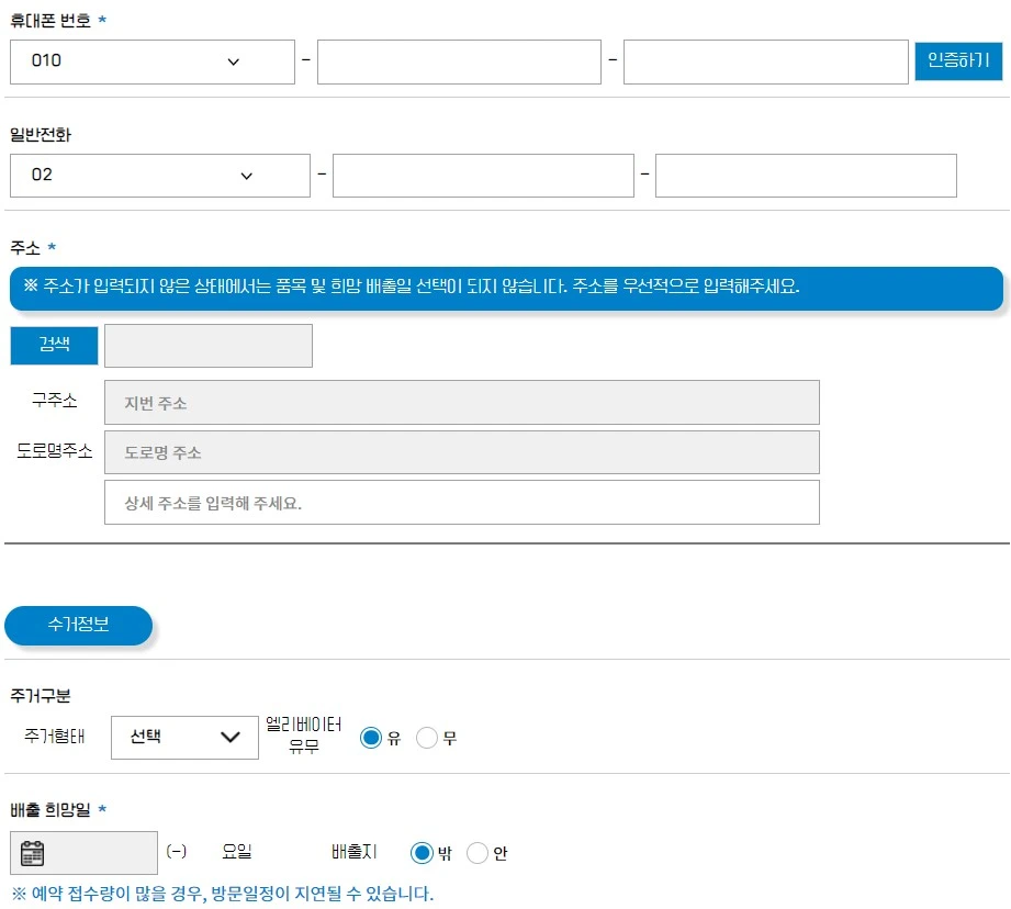 신청 순서 : 약관동의 → 배출관련 품목 지정 → 주소, 배출희망일, 시간 등 설정 → 신청