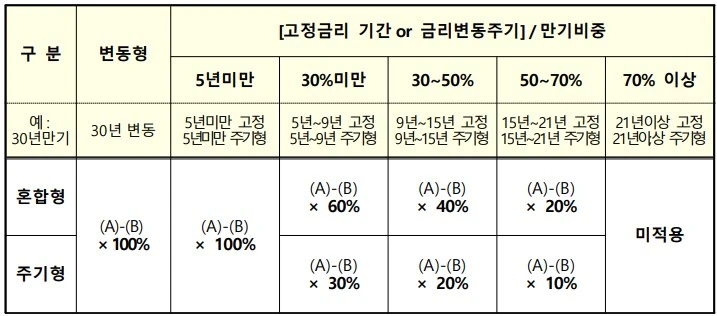 여기에 내 대출이 혼합형, 주기형, 변동형, 고정형 비율에 따라 가산금리 적용방식이 다릅니다. 고정금리 혹은 고정금리에 가까운 상품으로 할 수록 스트레스 금리를 모두 적용하지 않겠다는 것입니다. 아래 표를 보시면 고정금리 기간에 따라 미적용하거나 변동형은 100%까지 적용하는 방식입니다. 자세한 산출 내용은 금융위원회 보도자료를 확인하시기 바랍니다.