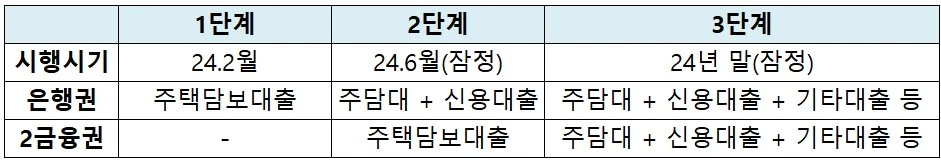 24년도는 단계적으로 적용되고 있습니다. 대출상품별 확대, 적용 스트레스 금리 확대 2가지가 있습니다. 대출상품별 확대는 아래 표와 같이 24년 상반기는 1금융권 주담대만 적용되며 하반기 신용대출로 확대, 25년도부터는 모든 대출에 대해 스트레스 금리가 적용됩니다. 2금융권도 단계적 확대되니 확인하시기 바랍니다.