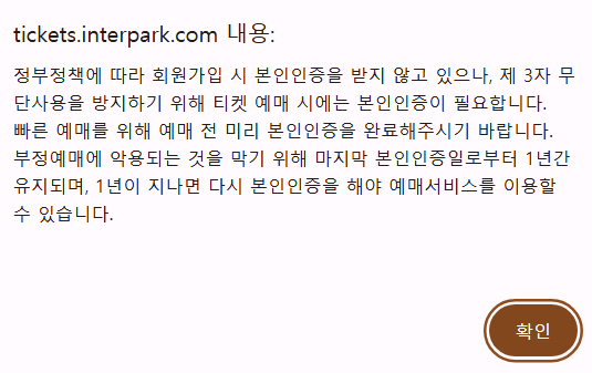 예매가 열려있는 여유있는 예매건으로 가셔서 본인인증을 미리 해보세요 예매하려면 본인인증이 필수이므로 정상적으로 이뤄지는지 점검하세요.