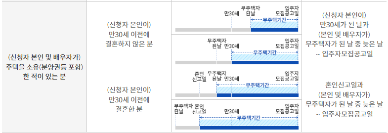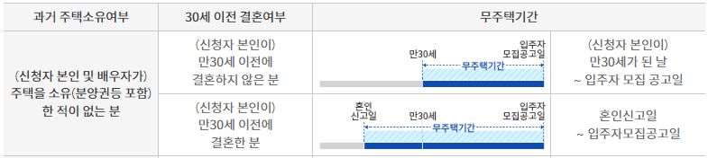 미혼인 경우 만 30세부터 기간을 산정하는 것으로 되어 있습니다. 만 30세 이전 결혼한 경우 혼인신고일 기준부터 무주택기간이 인정됩니다.