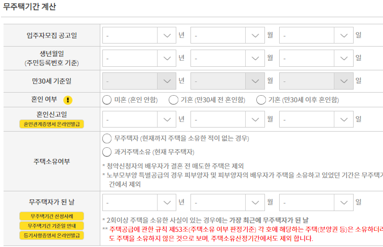 무주택기간 계산기가 청익홈에 마찬가지로 있기때문에 계산해보시면 되며 입주자모집공고일 / 생년월일 / 혼인여부 / 혼인신고일 / 주택소유여부 / 무주택자가 된 날(매도일) 을 입력하시면 무주택기간에 따른 가점을 계산해줍니다.