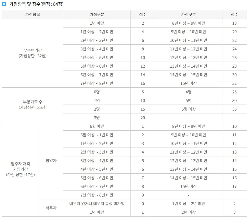 청약 가점 만점은 84점입니다. 앞서 설명드린 것처럼 무주택기간 총 32점, 부양가족 수 중 35점, 청약통장 가입기간 17점으로 구성되어 있습니다. 청약통장 가입기간 24년 달라진 점은 배우자의 가입기간을 합산할 수 있다는 것입니다.