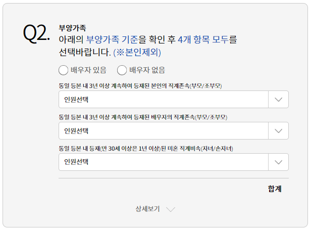 부양가족은 직계존속과 직계비속으로 나뉩니다. 직계존속의 경우 3년 이상 등본에 등재되어 있어야하며 배우자 또는 부양가족이 저가 주택이 아닌 주택을 소유한 경우 부양가족으로 보지 않습니다. 직계비속의 경우 1년이상 등본에 등재된 경우 부양가족으로 인정합니다.