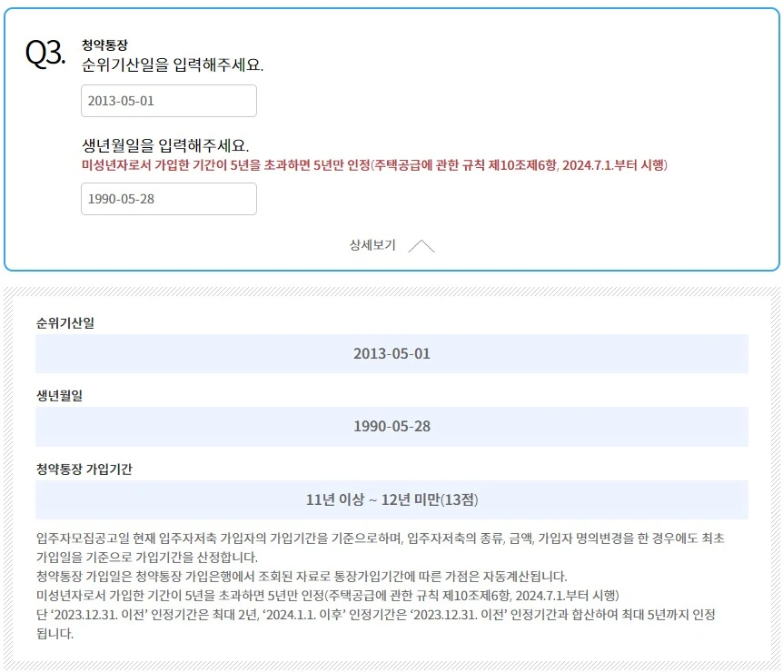 먼저 청약통장 가점을 계산하기 전 청약통장개설일과 생년월일을 입력해야 합니다. 그러면 다음과 같이 가정이 계산되는 것을 확인하실 수 있습니다.