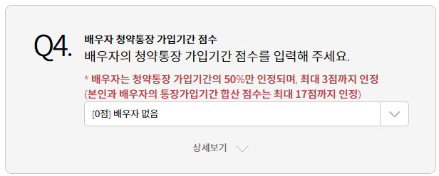 24년 신설된 제도이며 배우자 청약통장 가입기간은 최대 3점까지 인정되며 총점 17점은 같습니다. 다만 부부가 청약가입기간이 길지 않은 경우 합산하여 조금이라도 가점을 확보할 수 있습니다.